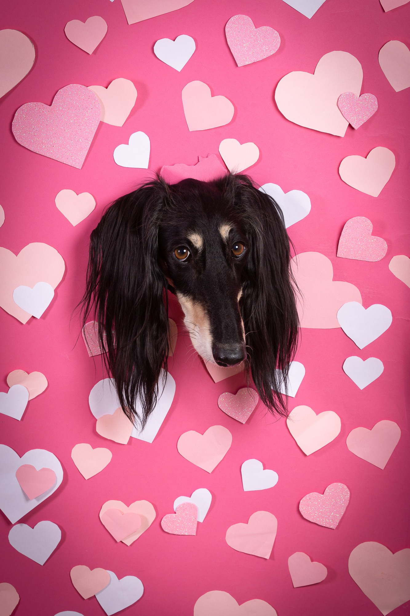 Обычно я люблю серьезные портреты с собак. Но иногда хочется подурачиться и сделать что-то милое и несерьезное. Поэтому специально ко дню всех влюблённых мы всей семьей вырезали много-много сердечек чтобы подготовить для вас эту фото-зону.